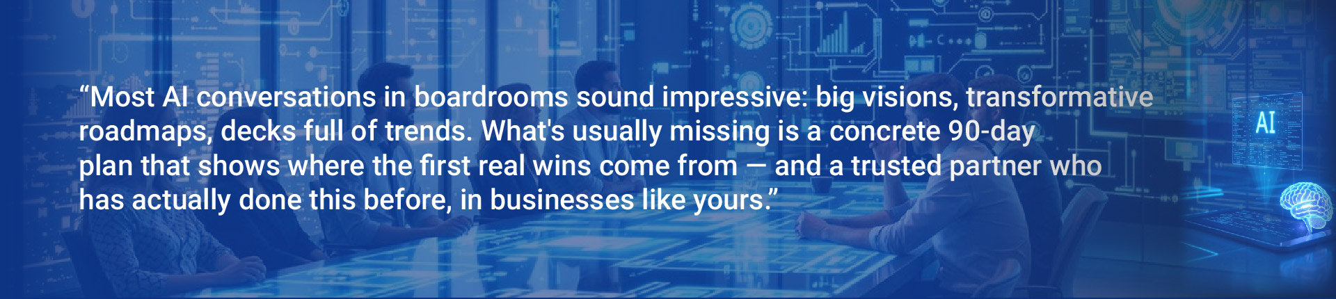 The fastest path to board support and budget commitment is a small number of visible wins, delivered quickly. The pilot phase selects 2–3 use cases from the shortlist — typically a mix of quick wins (high frequency, low complexity) and a strategic priority (higher value, medium complexity).